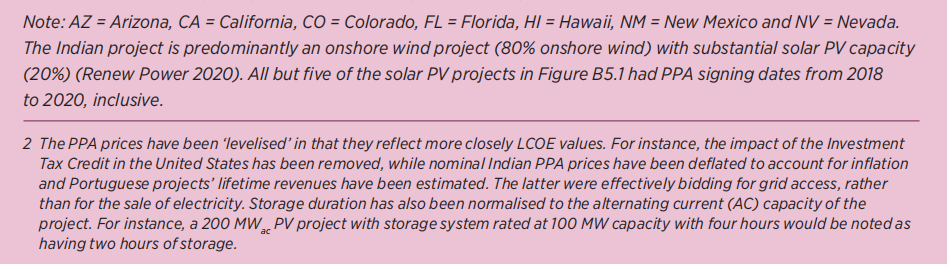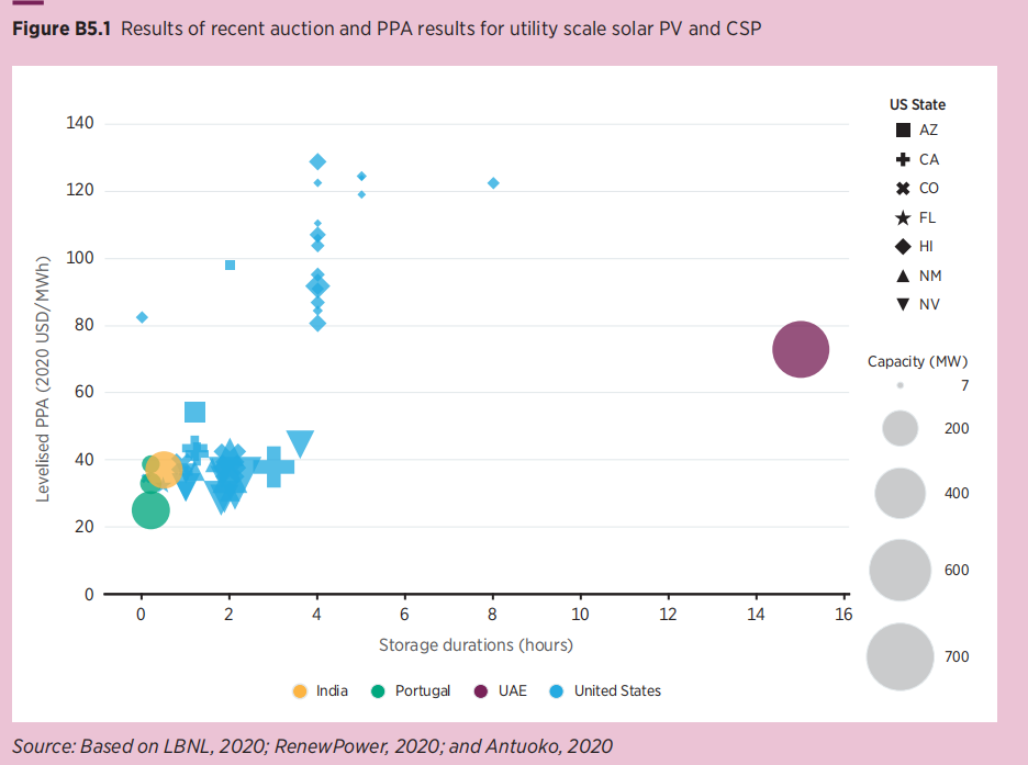 电池存储成本的快速下降值得称赞,因为它们对能源转型的重要性不断扩大,超出了电力部门。然而,如图 B5.1 所示,电池存储系统在其可以经济地提供的存储持续时间方面存在实际限制。B5.1 显示了印度、葡萄牙和美国的一系列结合电池储能的太阳能光伏项目的PPA (购售电协议)均价,以及迪拜穆罕默德·本·拉希德·阿勒马克图姆太阳能公园 700 MW太阳能热发电项目的 PPA 价格。