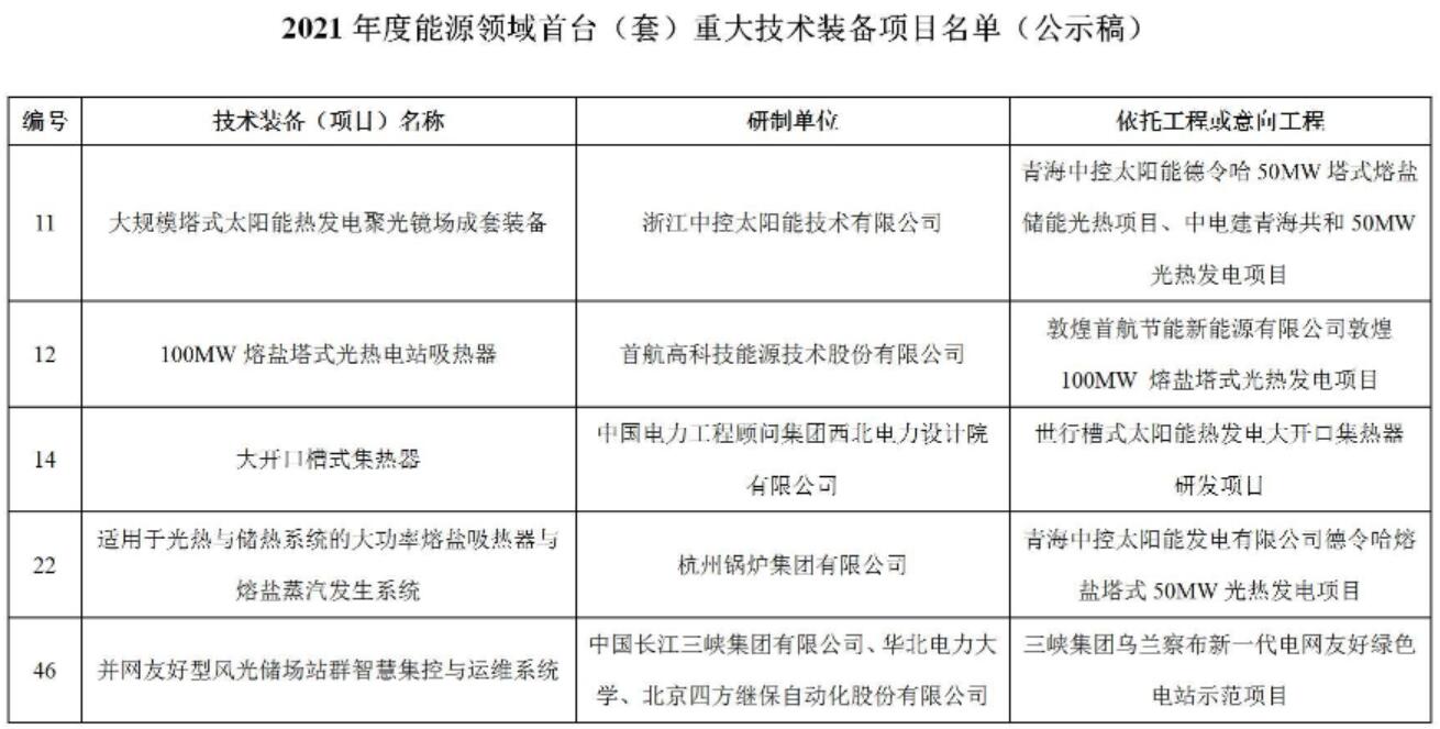 在太阳能热发电领域,依托国家首批太阳能热发电示范项目、国际合作项目等多项重大技术装备项目名列其中,主要有:太阳能光热联盟理事单位——浙江中控太阳能技术有限公司(现更名为“浙江可胜技术股份有限公司”)的“大规模塔式太阳能热发电聚光镜场成套装备”,首航高科技能源技术股份有限公司的“100MW熔盐塔式光热电站吸热器”,中国电力工程顾问集团西北电力设计院有限公司的“大开口槽式集热器”,杭州锅炉集团有限公司的“适用于光热与储热系统的大功率熔盐吸热器与熔盐蒸汽发生系统”等。