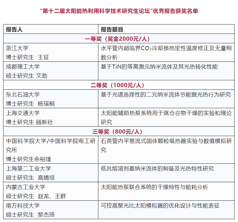论坛还评选出8个优秀报告,获奖同学将获得由太阳能光热联盟颁发的“优秀报告”证书,以及由“德芳太阳能热利用奖学金”资助的奖金。