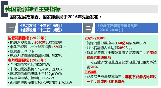 国家发展改革委、国家能源局于2016年先后发布《电力发展“十三五”规划》、《能源发展“十三五”规划》,《能源生产和消费革命战略 2016-2030)》,提出了能源转型能源革命的一些主要的战略目标,包括一些计划的指标,规划的指标。