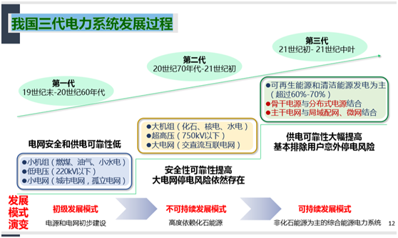 大概七八年前我们提出了三代电网这个概念,就把电力系统的发展分成三个阶段。第三代基本从本世纪开始,特征是以可再生能源和清洁能源发电为主,骨干电源和分布式电源结合。