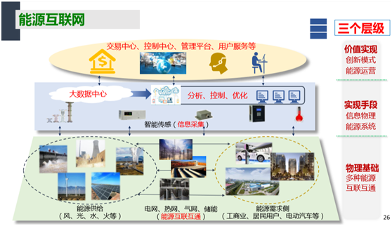 对于能源互联网的三个层级,应该说达到比较统一的认识。首先是有物理基础,是多种能源互联互通,从能源的供给,能源的传输包括电网、热网、气网以及能源的需求,用户等等。实现的手段是第二个层级,通过信息物理系统,包括传感、数据、大数据中心进行数据分析,实现对能源这些问题的分析控制和优化。第三个层级是价值实现。怎么样为用户服务,怎么样为交易服务,为市场服务,这个是我们要强调的,一个价值实现,创新商业模式,创新的运营模式,通过交易中心、运营中心,管理平台等等这个是非常重要,我们做能源的人常常忽视,没有好好解决这个问题,能源市场我们这个课题提出建立全国的包括电力在内的能源市场,但是大市场什么时候能实现也是很遥远的事情,要一步一步往前走,从能源互联网来说侧重价值的实现,这个是非常重要的。
