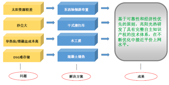 依据“追求系统整体可靠性和经济性的最佳统一”的创新原则,和“实现平价上网,适合产业化推广,能够走出国门,走向世界”的根本目标进行新技术综合研发,在关键技术上已实现突破并全面完成产业化准备——其独创的发电技术体系中,通过其总承包建设的华强兆阳张家口一号太阳能热发电站验证,完成了兆阳光热技术体系从理论到商业化验证的里程碑式发展。在深入分析研究各类技术路线的基础上取长补短,创新研发出兆阳聚光集热系统、DSG直接过热蒸汽传热技术、混凝土储热技术、系列综合实用技术四大类主要技术,全面实现与传统火力发电技术体系无缝对接。其线性聚光体系已完善定型,其可靠性和经济性已在15MW规模的实际电站工程上进行了验证。