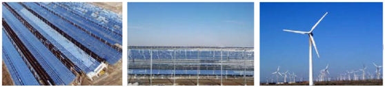兆阳光热的菲涅耳镜场集热器上部和镜场外部的区域可布置光伏电池模组,支架上可布置风机,可充分利用镜场面积中的太阳能和风能,实现光热、光伏及风力联合发电,进而通过微电网结构实现智能电力输出。