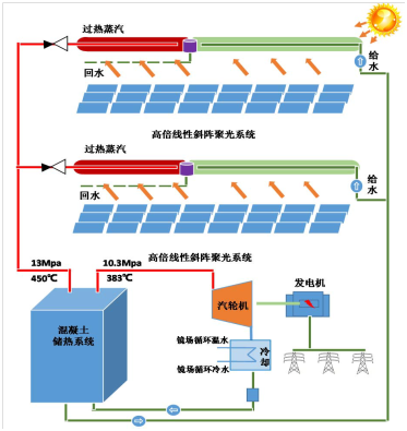 针对太阳资源不高的条件和大风限制条件,成功开发全球首创的东西轴倾斜布置的类菲涅耳式聚光集热系统,聚光倍率高达200倍(这是全球线性聚光技术体系中的最高聚光倍率),大幅提升集热效率,降低镜场造价。