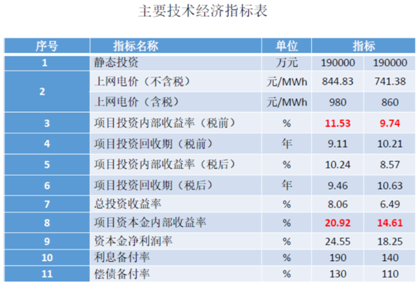 按机组年利用小时3400h进行经济评价,按上网电价为:含税电价980元/MWh,测算得项目投资内部收益率(税前)为11.53%。此时,总投资收益率为8.06%,项目资本金内部收益率20.92% ,资本金净利润率为24.55%。
