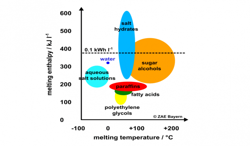 开发相变材料的最大挑战是,它们通常在固态材料变成液体,反之亦然。在接近转变点的有限温度范围内提供大量热量。这意味着材料的熔化温度必须符合给定应用的要求。如今,最著名的PCM是水-冰,其熔点为零度,以及包含盐水合物的加热包,它们在约58°C时会发生相变。