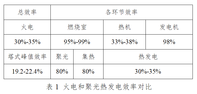 以简单循环发电的气电为例,发电效率效率是燃烧室效率(95%-99%)、热机效率、发电机效率(98%)三个环节效率的乘积。5万KW级的火电机组,煤电发电效率约30%(塔式工质工作温度接近煤电),气电约30%-35%(蝶式工质温度接近气电)。