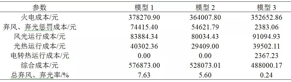 论文针对所构建的风-光-光热联合发电系统,通过在调度策略中引入价格型需求响应,构建了风–光–光热联合发电系统日前优化调度模型,该模型以系统综合成本最低为目标,通过引入需求响应模型以及对系统中的风光出力、负荷、负荷响应量等波动量的预测误差进行不确定性建模,考虑各电站运行约束,系统内部能量平衡约束等,最终调用CPLEX进行求解。通过采用三种不同调度模型(模型3采用本文调度策略)并基于西北地区实际电站数据的算例仿真,验证了所提调度策略能够有效提高系统风光消纳能力。表1为三种不同调度模型效果对比。