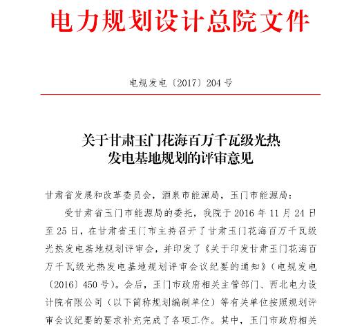 8月1日,玉门市取得中国电力规划设计总院《关于玉门花海五百万千瓦光热发电基地规划的评审意见》,这标志着玉门花海五百万千瓦级光热发电基地规划报告完全达到设计深度要求,顺利收口。