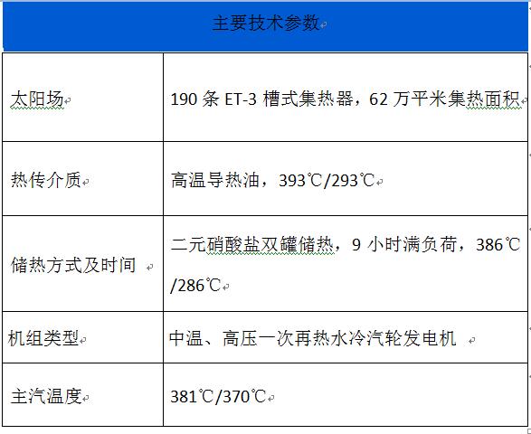 该项目全部采用抛物面槽式(PTC)导热油太阳能热发电技术,主要建设190个槽式集热器标准回路,设置一套双罐二元硝酸盐储热系统(储热容量满足汽轮发电机组满负荷9小时的运行需要),一套50MW规模的中温、高压、一次再热的汽轮发电机组和其他电站所需配套设施。本期工程建成后等效利用小时数可达3950小时,并具有调峰能力,预计每年可以减少CO2排放约10万吨。