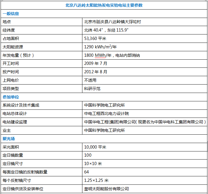 电站位于北京市延庆县八达岭镇大垺坨村,是在国家“十一五”863项目支持下,由中国自主设计与建造的第一座兆瓦级规模的塔式太阳能热发电实验示范站,系统额定发电功率1MW。电站站址距离北京市中心65公里。