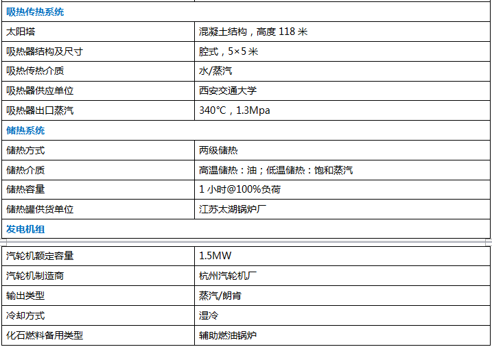 电站定日镜场由100台定日镜组成,每台定日镜的有效反射面积为100m2。定日镜以集热塔上的腔式吸热器采光口为中心,自南向北呈扇形分布。采用水/蒸汽作为吸热传热介质。集热塔高118米,吸热器开口面积为5×5米。蓄热系统容量可满足汽轮机以1MW功率发电1小时,蓄热系统为两级蓄热,蓄热介质分别为VP-1导热油和过热蒸汽。蒸汽轮机额定功率为1.5MW,电站采用湿冷技术。