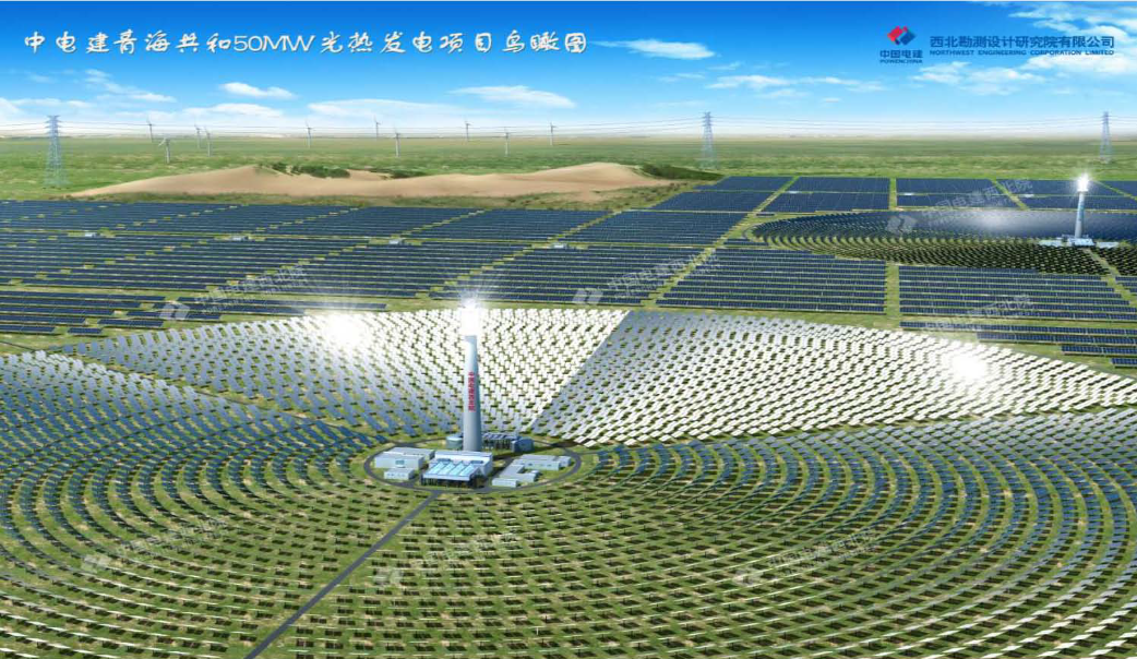 中电建青海共和光热发电示范项目位于青海省海南州共和县海南生态太阳能发电园区,建设规模50MW,采用1台塔式太阳能热发电机组,配套建设6小时的 熔盐储热系统。项目总投资预计11.9亿元,20%自有资本金,80%银行贷款。中国电建西北院为项目投资主体,项目公司为:共和西北水电光热发电有限公司。