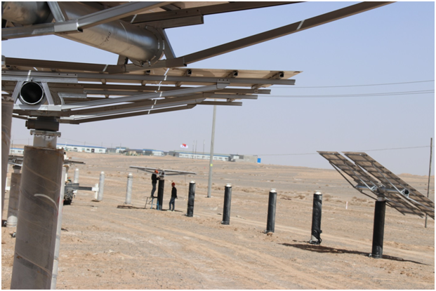 该项目是国家首批20个示范项目中2017年正式开工建设的、为数不多的项目之一。项目位于玉门市郑家沙窝光热发电示范区,计划建设总装机容量为50MW熔盐塔式光热电站,包括光岛、储热系统、动力岛、生产基地和运维基地,同时配套建设相关附属设施。该项目于2016年9月取得项目备案文件,2017年6月初取得开工许可手续并全面开工建设;并在2017年封冻前完成了办公住宿临舍的搭建,动力岛主厂房基础浇筑,1号模块二次反射塔基础浇筑,定日镜基础交安,二次反射塔钢结构已运至项目现场;2017年12月、2018年1月,项目业主和建设单位克服零下十几度的高寒,完成了部分定日镜的安装施工。
