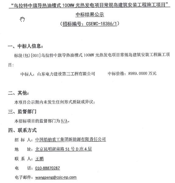 附:乌拉特中旗导热油槽式100MW光热发电项目常规岛建筑安装工程施工项目中标结果公示