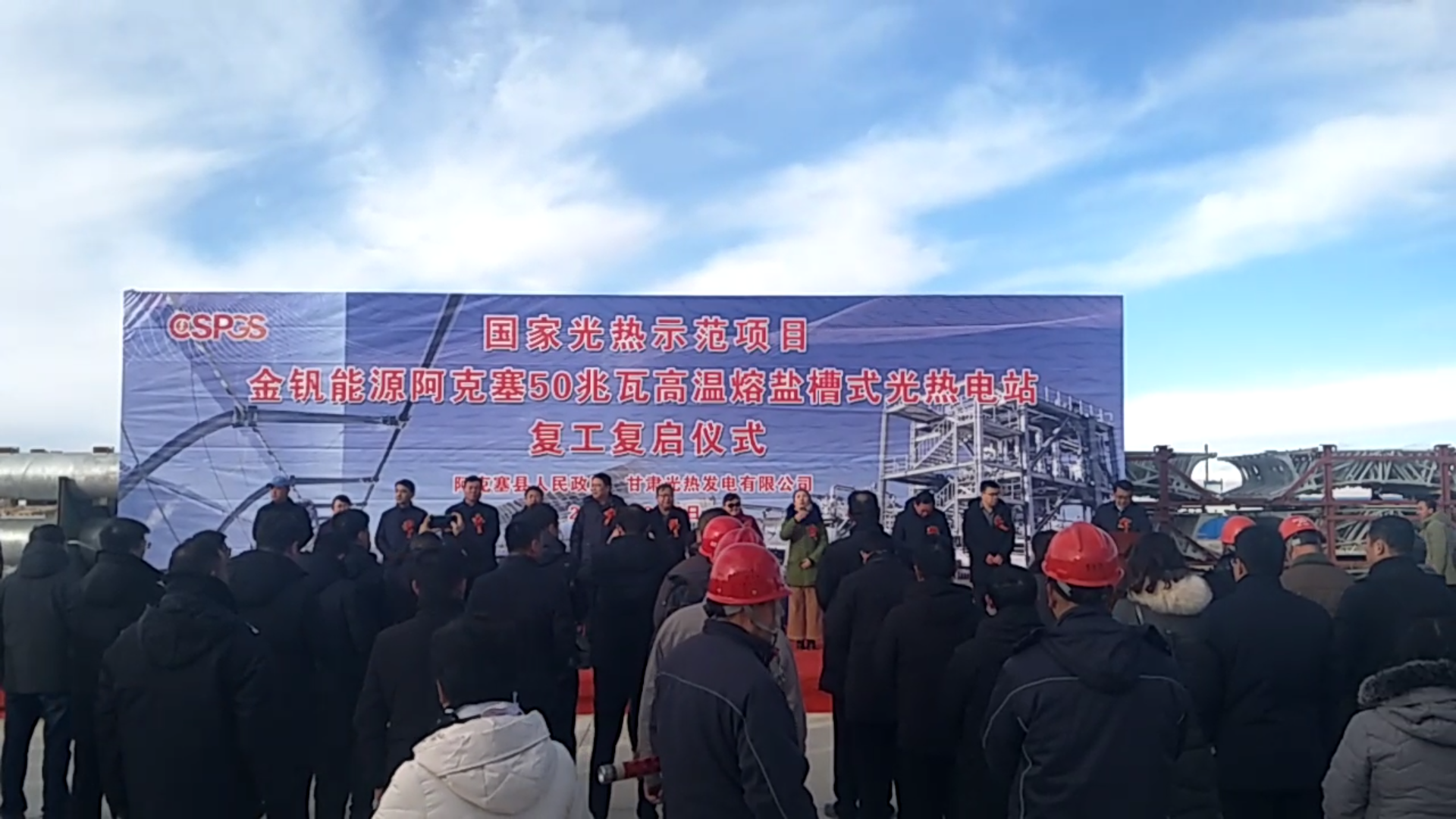 12月6日,国家首批太阳能热发电示范项目——深圳市金钒能源科技有限公司(简称金钒能源)阿克塞50MW熔盐槽式光热发电示范项目在甘肃阿克塞县举行隆重的复工复启仪式。“这标志着经过几年的曲折,该项目终于盘活。”酒泉市委常委、常务副市长何效祖复启会上说。