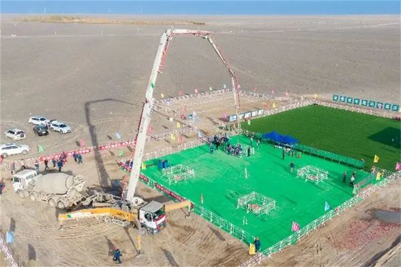 哈密-重庆±800千伏特高压直流输电线路工程新疆段首基铁塔基础浇筑仪式。(周广科 摄)