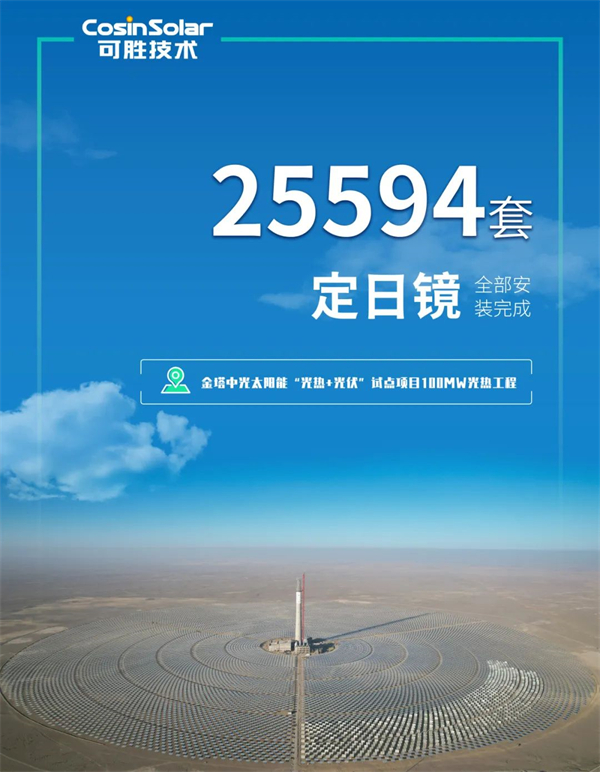 据国家光热联盟理事单位——浙江可胜技术股份有限公司(简称:可胜技术)消息,12月26日,金塔中光太阳能“光热+光伏”试点项目10万千瓦光热工程顺利完成第25594面定日镜安装,这标志着项目定日镜的组装、安装工作已全部完成。