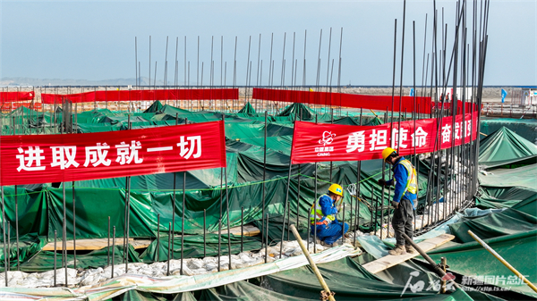 3月12日,在新疆自治区博乐市五台工业园区博州10万千瓦储热型光热配建90万千瓦新能源项目建设现场,近200名工人正在施工作业。该项目目前已完成吸热塔基础浇筑、主厂房基础浇筑、汽轮发电机基础浇筑,厂前区、组装车间主体结构建设等,预计于今年年底完成并网发电。