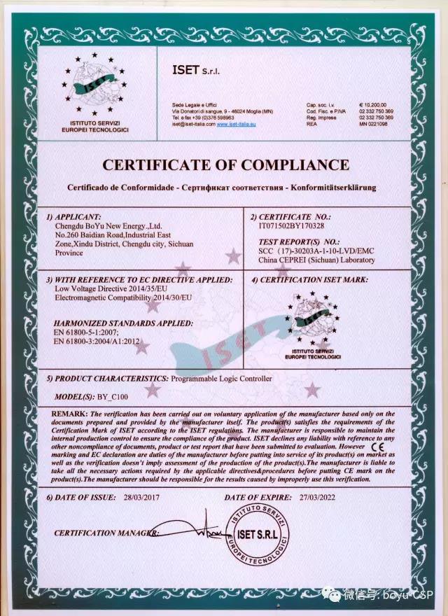 博昱新能)拥有自主知识产权的太阳能跟踪控制产品通过CE认证,获得证书。该产品是太阳岛的核心部件,用于槽式镜场和塔式镜场的跟踪控制。在槽式应用领域,该产品已经在博昱德令哈实验回路的实际工况中稳定运行了2年以上。在塔式应用领域,该产品已经在宿迁光电中心塔式项目上稳定运行近一年。