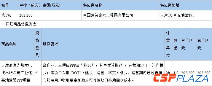7月21日,天津滨海光热发电技术研发与产业化基地建设PPP项目公布中标结果。据公告显示,中国建筑第六工程局有限公司中标该项目,中标金额为202,200万元。该中标结果的公告期限为1个工作日。