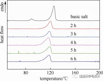(1)一定条件下的高温处理可降低LiNO3-NaNO3-KNO3三元硝酸盐固相线温度,在680 ℃下处理2h得到了最低的固相线温度63.0 ℃。
