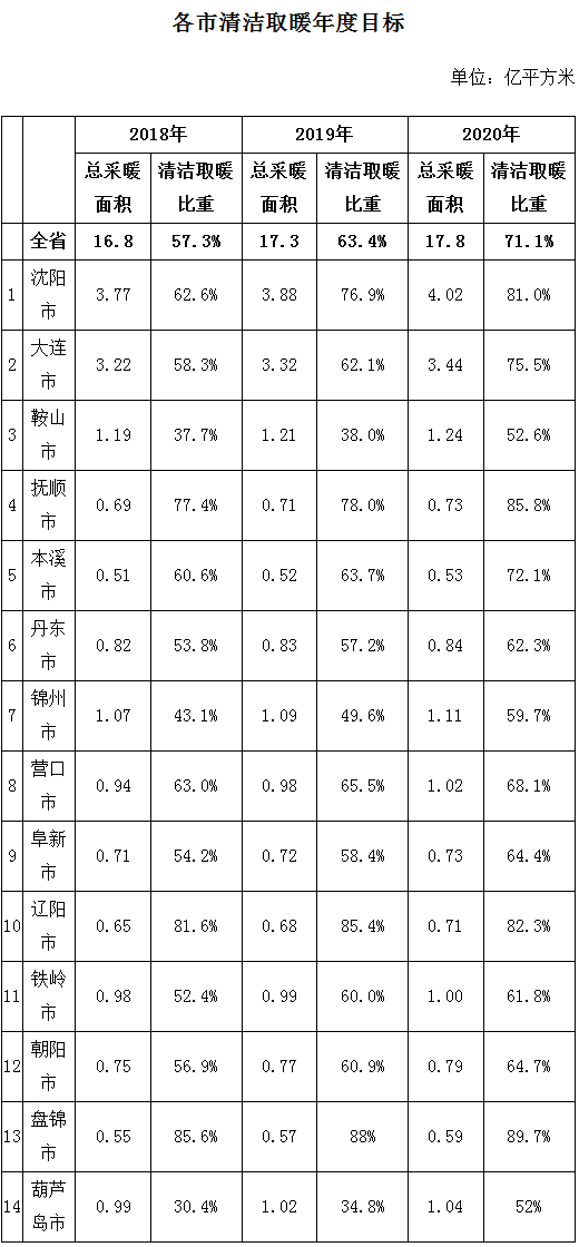 日前,辽宁省人民政府办公厅发布《辽宁省推进全省清洁取暖三年滚动计划(2018-2020年)》规定,按照由城镇到农村分层次全面推进的总体思路,加快提高清洁取暖比重。城镇优先发展集中供暖,集中供暖难以覆盖的,加快实施各类分散式清洁取暖。农村地区优先利用地热、生物质、太阳能等清洁能源取暖,有条件的地区发展天然气或电供暖,适当扩大集中供暖延伸覆盖范围。不能通过清洁取暖替代散烧煤取暖的,重点利用“洁净型煤+环保炊具”的模式替代散烧煤取暖。力争2020年,全省清洁取暖率达到70%以上。