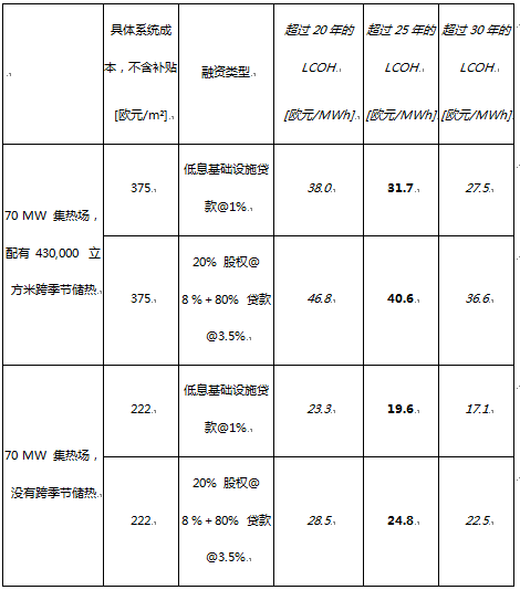 Holter:这是一个经销商价格,它综合了整个安装过程中的资本支出( CAPEX ),包括季节性储热、管理和融资,以及项目期间的运行和维护费用。在这种情况下,我们谈论的超过25年的全部成本总计。36欧元/兆瓦时的热价是31.7欧元/兆瓦时至40.6欧元/兆瓦时之间的平均值,具体取决于融资类型(见下表)。在我们的计算中,我们使用了70MW的最小集热场容量,并将季节性存储和热泵的供应温度设置为85℃。如果温度需要更高,可以增加热泵或锅炉。