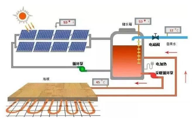 太阳能采暖系统主要由真空管集热器、储热保温水箱、地板采暖系统以及控制系统等组成,可分为以下三个部分了解整体系统的运行: