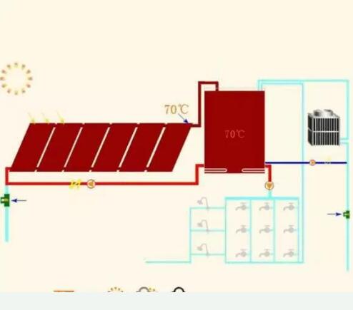太阳能热水系统是将太阳能转换成热能以加热水的装置。通常包括太阳能集热器、贮水箱、泵、连接管道、支架、控制系统和必要时配合使用的辅助能源。