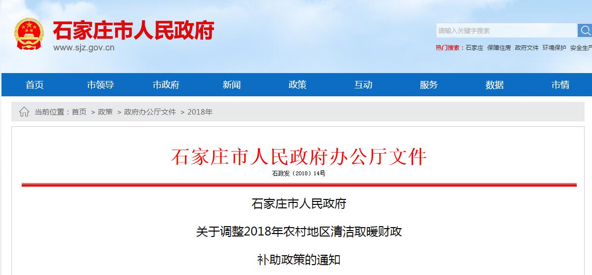 按照《河北省2018年冬季清洁取暖工作方案》(冀代煤办〔2018〕29号)、《关于调整完善农村地区清洁取暖财政补助政策的通知》(冀代煤办〔2018〕30号)有关要求,结合我市实际情况,为保证政策的连续性和稳定性,对2018年农村地区清洁取暖财政补助政策进行了调整,有关事宜通知如下: