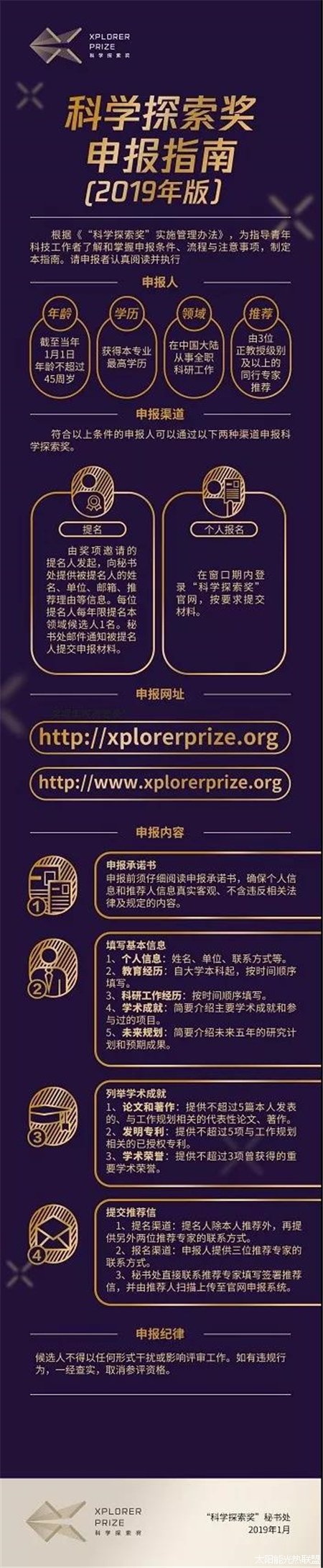 与此同时,“科学探索奖”申报指南以及管理办法也正式对外公布。青年科技工作者可以根据相关指引,即日起至2019年4月15日,通过“科学探索奖”官方网站 (申报官网:http://www.xplorerprize.org),以及“科学探索奖”官方服务号(ID:XplorerPrize)进行申报。
