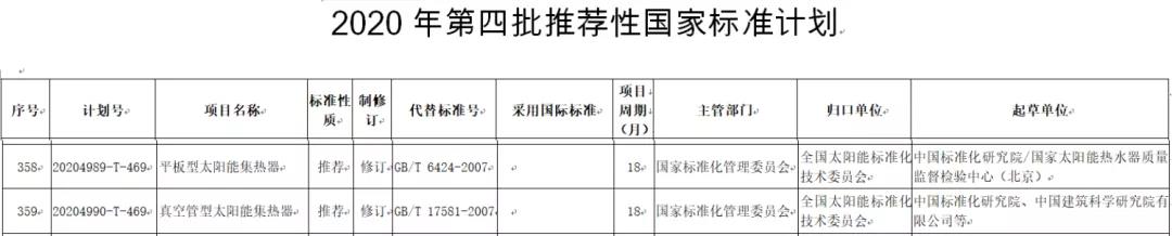 2020年12月24日,国家标准化管理委员会下达了《2020年第四批推荐性国家标准计划》(国标委发〔2020〕53号)。其中,国家标准《平板型太阳能集热器》GB/T 6424、《真空管型太阳能集热器》GB/T 17581被列入修订计划。