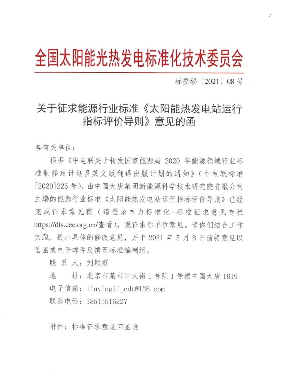 近日,全国太阳能光热发电标准化技术委员会发布了关于征求能源行业标准《太阳能热发电站运行指标评价导则》(以下简称《导则》)意见的函。