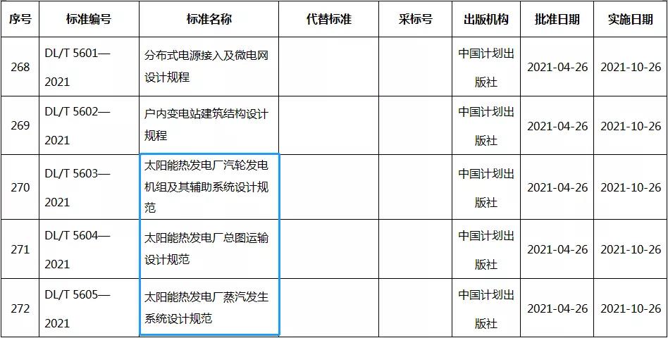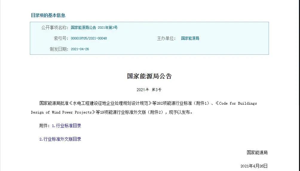 此外,本次公告还发布了《风光储联合发电站运行导则》(NB/T 10625—2021)、《风光储联合发电站监控系统技术条件》(NB/T 10630—2021)、《参与辅助调频的电厂侧储能系统并网管理规范》(DL/T 2313—2021)、《电厂侧储能系统调度运行管理规范》(DL/T 2314—2021)等行业标准,批准日期为2021年4月26日,将于2021年10月26正式实施。