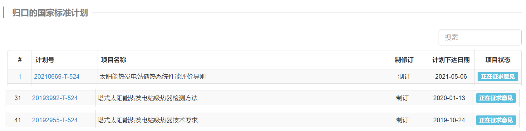 全国标准信息公共服务平台显示,《太阳能热发电站储热系统性能评价导则》、《塔式太阳能热发电站吸热器检测方法》和《塔式太阳能热发电站吸热器技术要求》等三项国家标准正在征求意见。