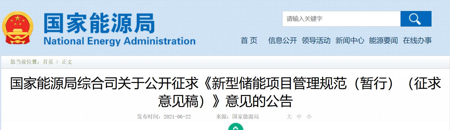 为贯彻落实党中央、国务院关于做好碳达峰、碳中和工作的总体部署,促进新型储能积极稳妥健康有序发展,支持以新能源为主体的新型电力系统建设,加快构建清洁低碳、安全高效的能源体系,国家能源局组织起草了《新型储能项目管理规范(暂行)(征求意见稿)》,现向社会公开征求意见。