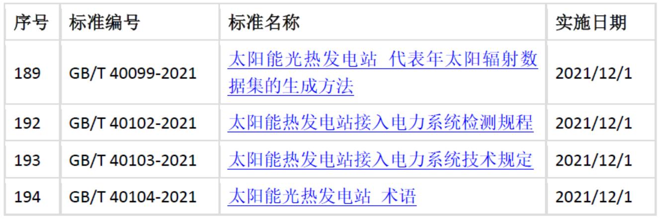 据国家标准委网站消息,国家市场监督管理总局和国家标准化管理委员会于今日发布2021年第7号中国国家标准公告,批准发布386项推荐性国家标准和3项国家标准修改单。其中,《太阳能光热发电站 代表年太阳辐射数据集的生成方法》、《太阳能热发电站接入电力系统检测规程》、《太阳能热发电站接入电力系统技术规定》和《太阳能光热发电站 术语》4项太阳能热发电国家标准发布,并将于2021年12月1日实施。