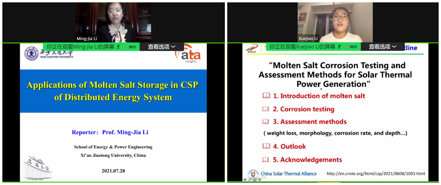 7月28日20:00(北京时间),ATA Insights和win德赢网 (China Solar Thermal Alliance 简称CSTA)合作举行国际网络研讨会——熔盐储能塔式光热电站确保可融资的关键点(Key aspects to securing a bankable CSP tower with molten salt storage),来自西安交通大学的李明佳教授、中国科学院上海应用物理研究所的李雪娇博士以及浙江中控太阳能技术有限公司欧洲、中东、非洲区域业务开发负责人赵鹏飞连线ATA Insights CEO,分享各自领域的研究成果和观点。
