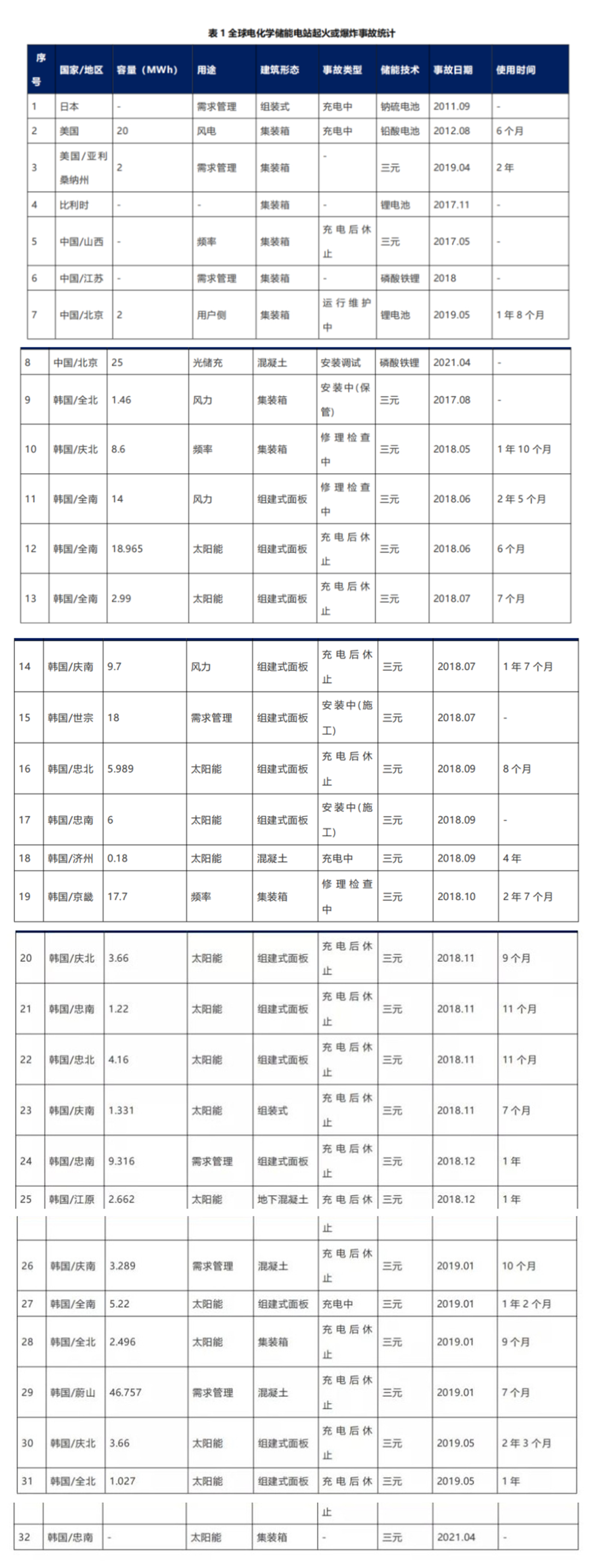 2011-2021年间,全球储能项目主要火灾或爆炸事故。(来源:能源日参)