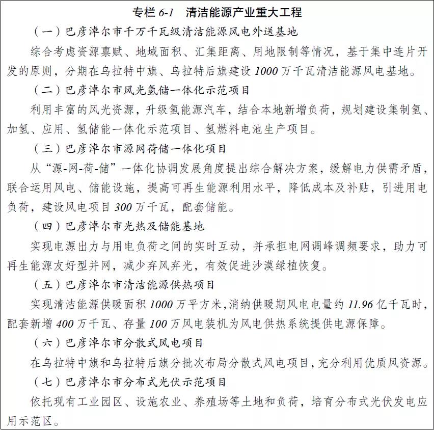 《通知》还列出了七个清洁能源产业重大工程【详见下表】,其中包含巴彦淖尔市光热及储能基地。