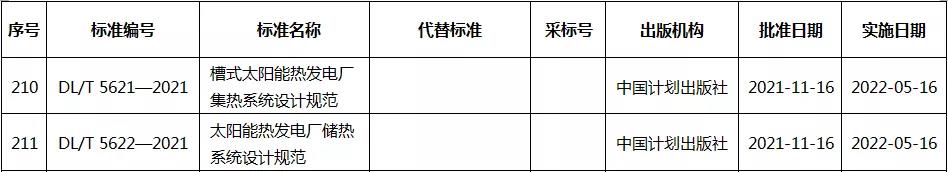 近日,国家能源局发布 2021年第5号公告。公告批准发布《地热井井身结构设计方法》等326项能源行业标准、《Code for Seismic Design of Hydraulic Structures of Hyower Project》等19项能源行业标准外文版、《水电工程水工建筑物抗震设计规范》等3项能源行业标准修改通知单,其中包含《 槽式太阳能热发电厂集热系统设计规范》和《太阳能热发电厂储热系统设计规范》两项光热发电标准