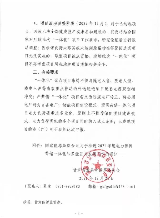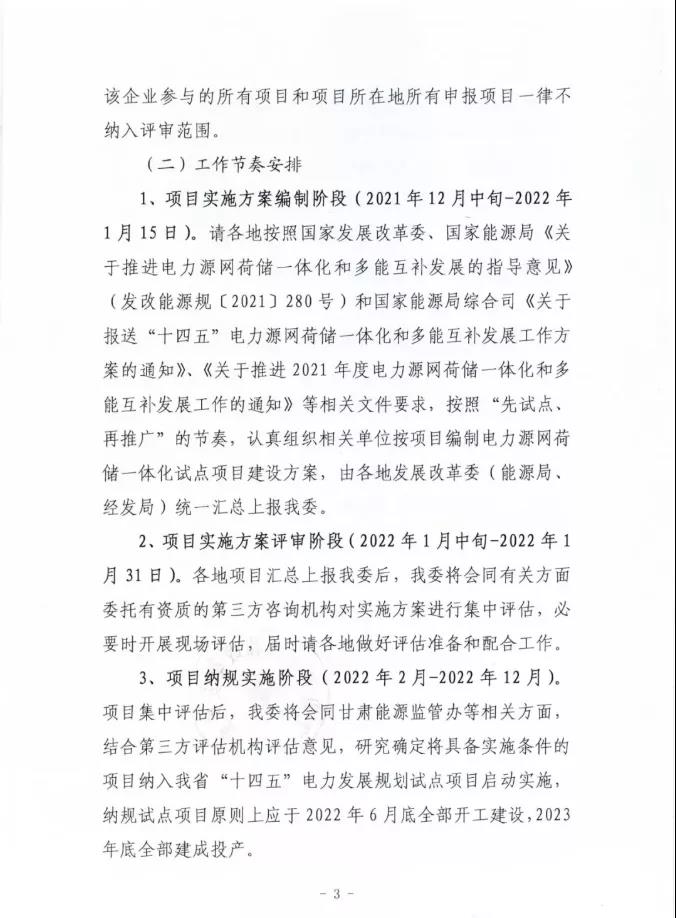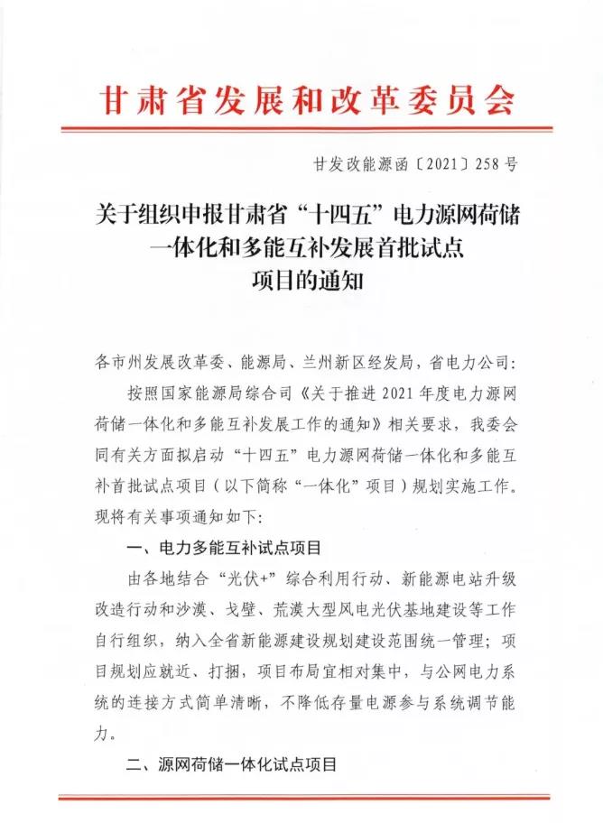 12月20日,甘肃省发改委印发《关于组织申报“十四五”电力源网荷储一体化和多功能互补发展首批试点项目的通知》,就项目申报有关事项给出具体指导。