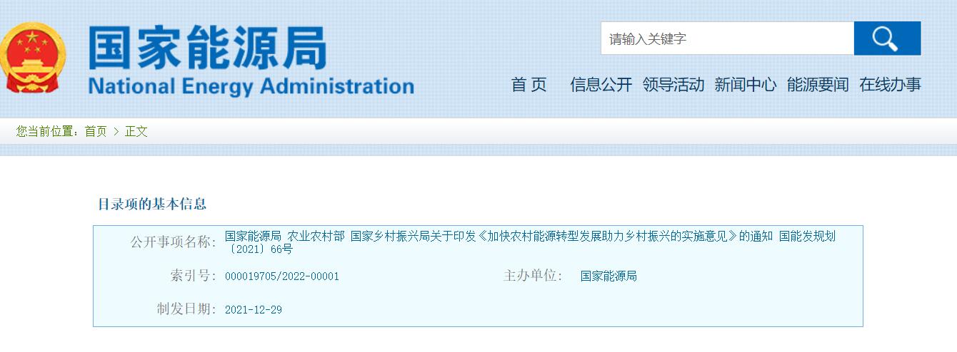 1月6日,国家能源局 农业农村部 国家乡村振兴局印发《加快农村能源转型发展助力乡村振兴的实施意见》。意见提出,到2025年,建成一批农村能源绿色低碳试点,风电、太阳能、生物质能、地热能等占农村能源的比重持续提升,农村电网保障能力进一步增强,分布式可再生能源发展壮大,绿色低碳新模式新业态得到广泛应用,新能源产业成为农村经济的重要补充和农民增收的重要渠道,绿色、多元的农村能源体系加快形成。