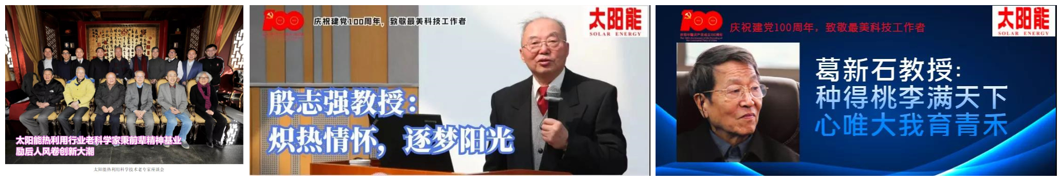 ◐ 为展现在党的领导下可再生能源和新能源领域内科技工作者实现的辉煌成就和崇高的精神风貌,由中国可再生能源学会党委指导开展的“庆祝建党100周年·致敬最美科技工作者”征文活动,经广泛征集及遴选,选树出一批最美科技工作者和创新团队典型,陆续将于中国可再生能源学会官网、微信公众号及《太阳能杂志》公众号进行报道。其中刊载了太阳能光热联盟选送的《【庆祝建党100周年·致敬最美科技工作者】太阳能热利用行业老科学家秉前辈精神基业,励后人风卷创新大潮》《【庆祝建党100周年·致敬最美科技工作者】殷志强教授:炽热情怀,逐梦阳光》《【最美科技工作者】葛新石教授:种得桃李满天下,心唯大我育青禾》(被选为《太阳能》杂志封面文章)。