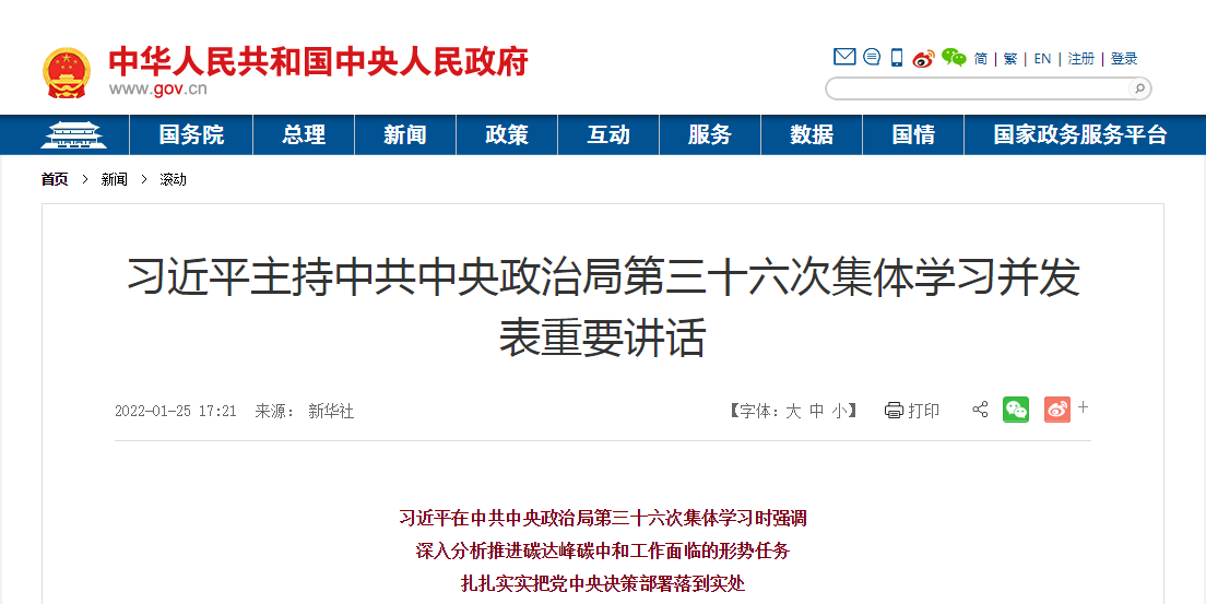 1月24日下午,中共中央政治局就努力实现碳达峰碳中和目标进行第三十六次集体学习。中共中央总书记习近平在主持学习时强调,实现碳达峰碳中和,是贯彻新发展理念、构建新发展格局、推动高质量发展的内在要求,是党中央统筹国内国际两个大局作出的重大战略决策。