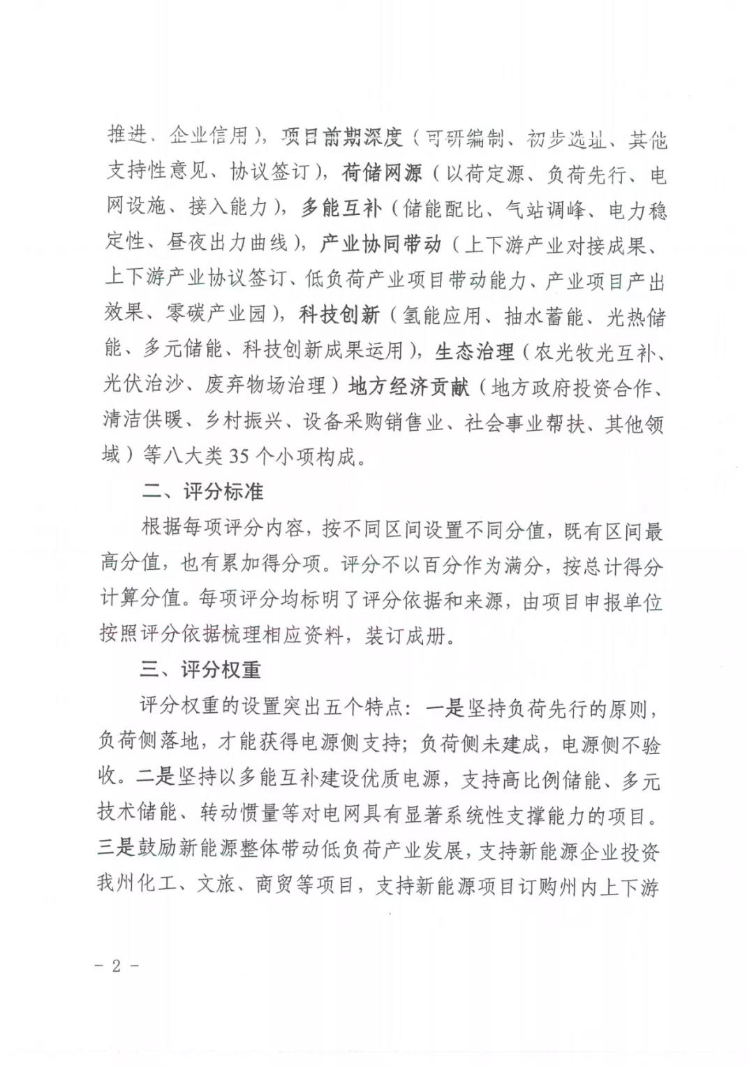 评分权重设置了五个突出点,一是负荷先行,负荷侧落地才能获得电源侧支持,负荷未建成则电源不验收;二是以多能互补建设优质电源;三是鼓励新能源投资化工、文旅、商贸等项目,支持采购州内产品;四是突出氢能和