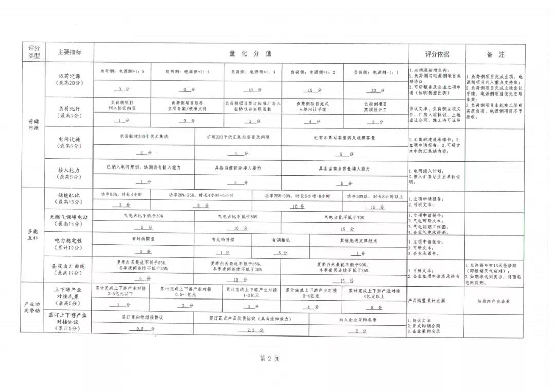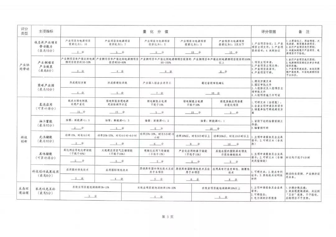 根据文件,其评分内容主要包括企业投资能力、项目前期深度、荷储网源、多能互补、产业协同带动、生态治理以及地方经济贡献等八大类,各类项目下面细小划分35个小项。不同类别之间设置不同分值,以总得分计算排序。