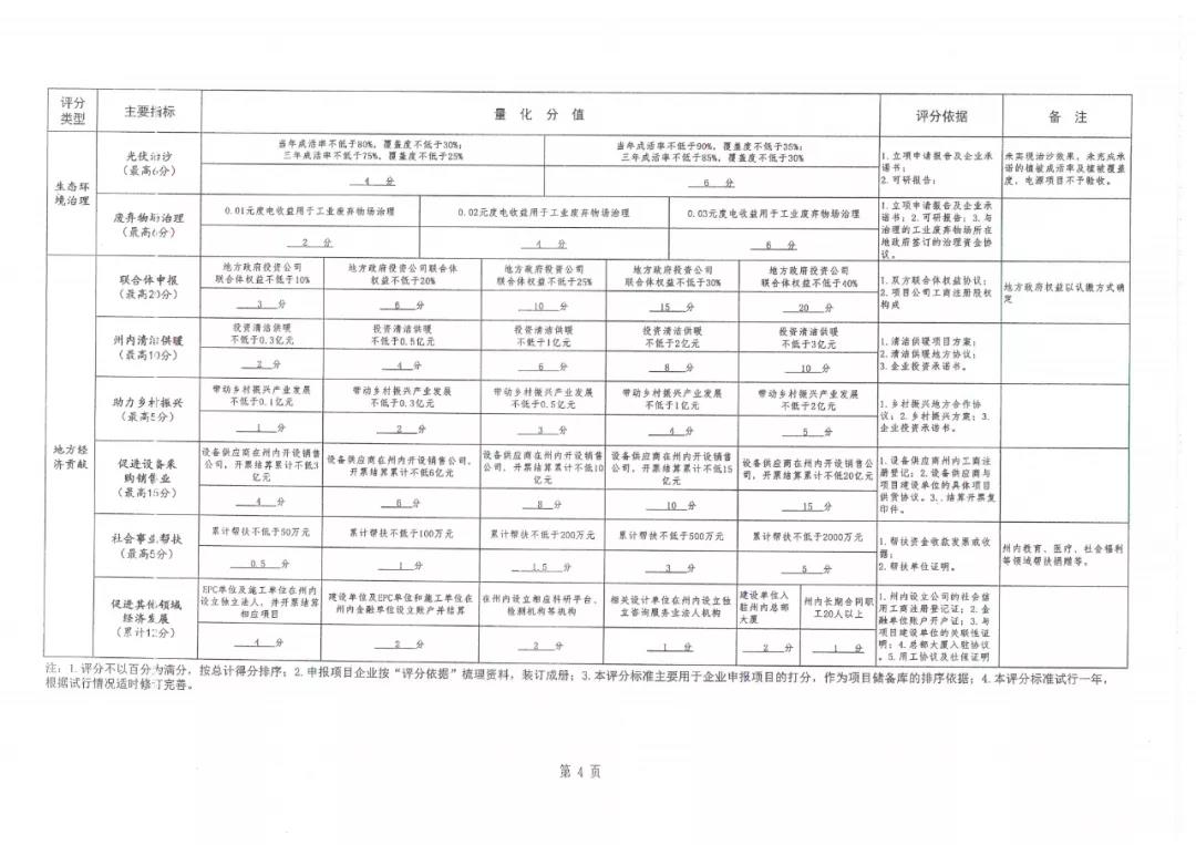 光热、储能以及科技创新成果应用等。生态环境治理为三个指标,最高可得17分,主要是光伏+、光伏治沙以及废弃物治理。